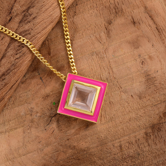 Square Rose Quartz Enamel Hued Necklace