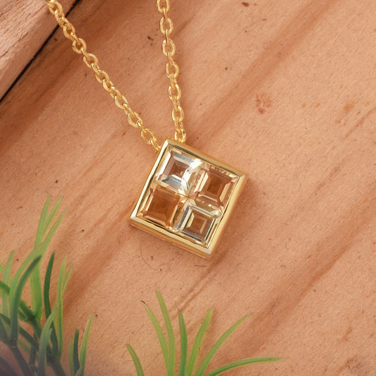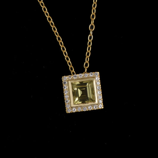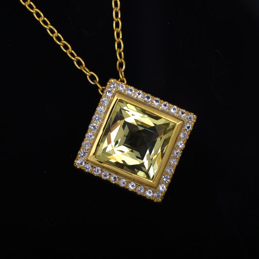 Lemon Quartz Square Halo Necklace